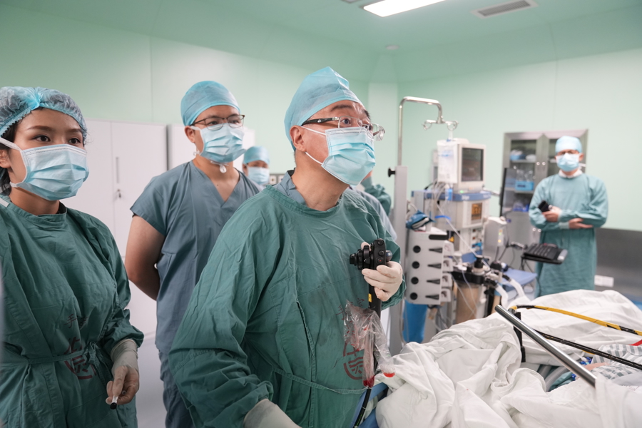 为寻求更精准、微创的治疗,经当地内镜医生介绍后李先生辗转来到复旦大学附属中山医院内镜中心。“鱼刺位置非常凶险,就在贲门旁刺入左肝,紧贴大血管。”接诊的周平红主任介绍,“病程长、腹腔感染粘连严重,术中可能找不到鱼刺,一旦操作不慎也会造成内镜下无法控制的大出血。”周主任提出了个大胆的设想——能否通过胃镜,在食道管壁夹层建个隧道“开一扇门”,直接进入腹腔取出鱼刺?这个想法意味着要让内镜“跨越”胃壁的天然边界,是一次前所未有的尝试。术前,周平红主任带领内镜团队按照术前CT检查,反复推演每一步操作路径,力求安全与精准兼顾,在手术开始前由团队蔡明琰副主任医师进行超声内镜精准定位,为建立黏膜下隧道指明方向。